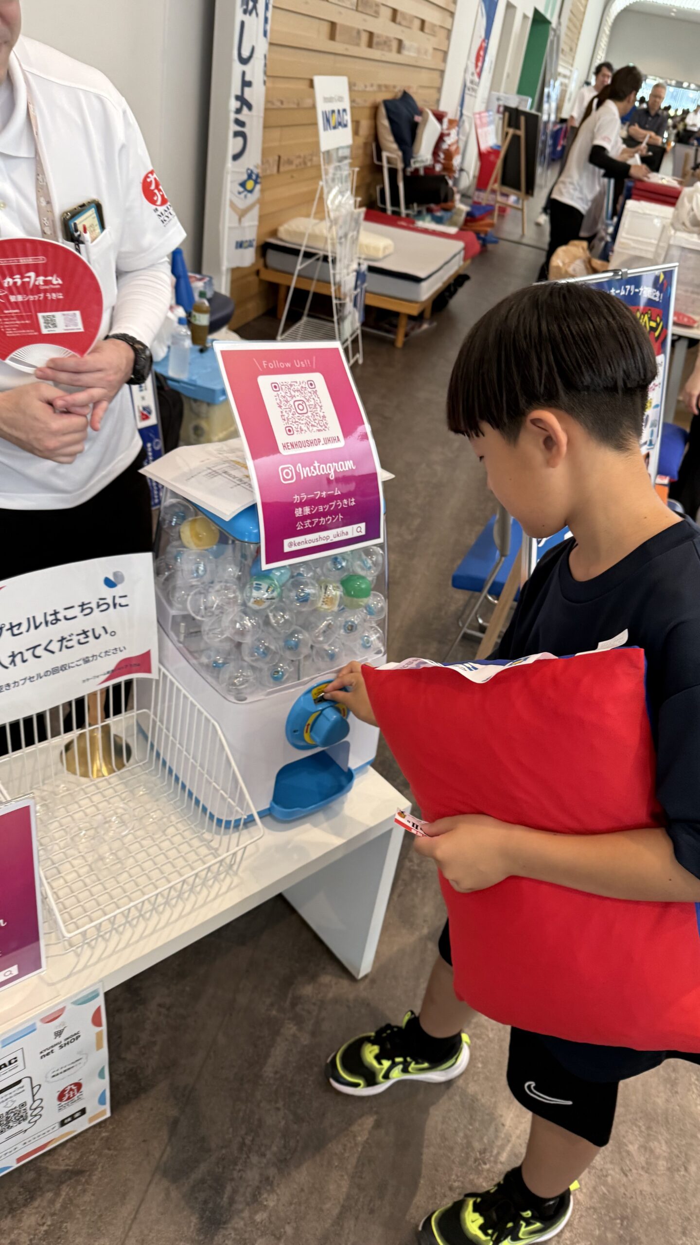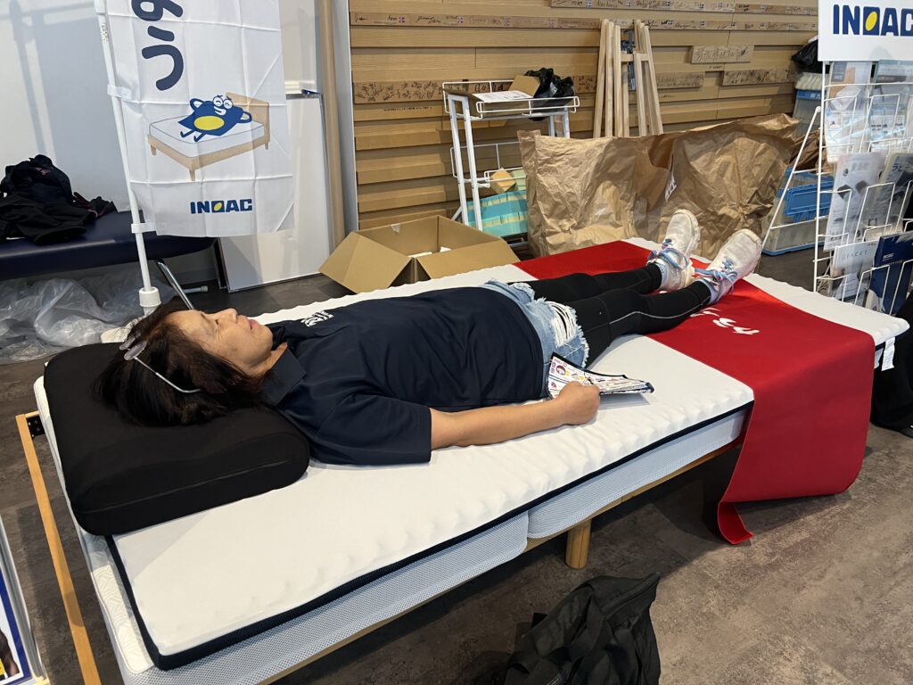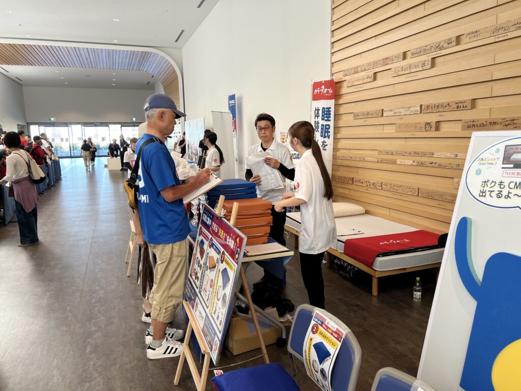 当日は会場入口付近で「シートクッション無料貸出」「選手と同じ寝具の体験」