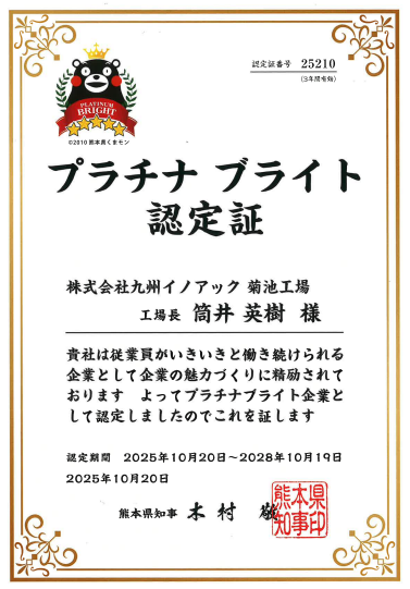 この度、株式会社九州イノアック 菊池工場が熊本県プラチナブライト企業に認定されました。