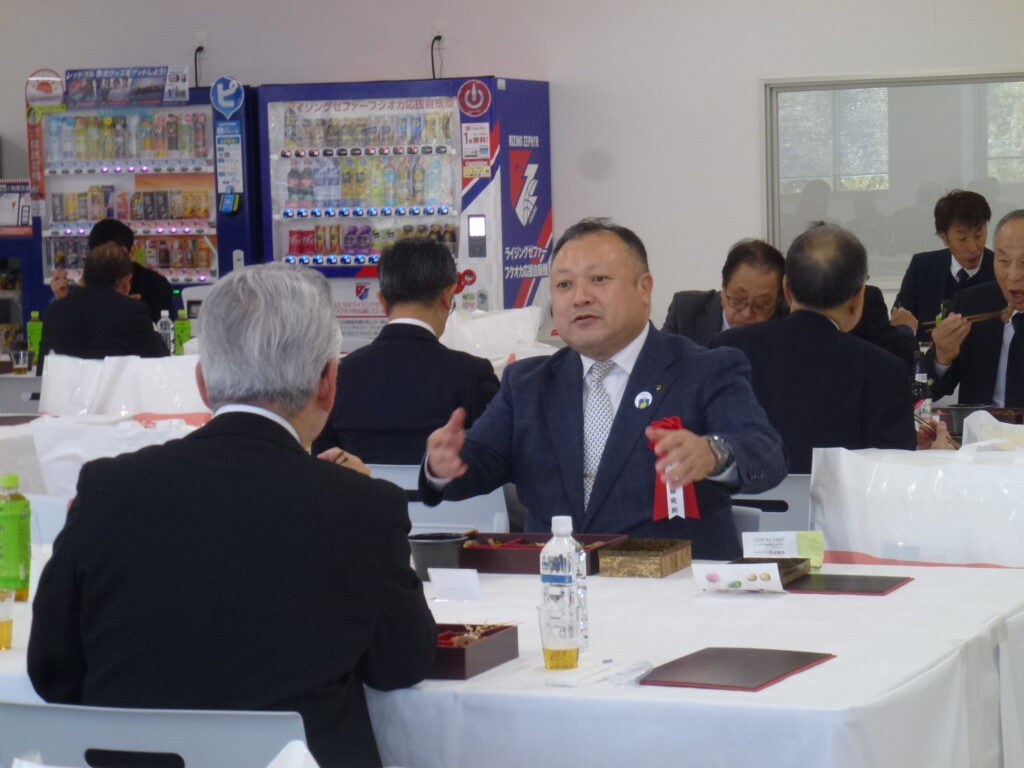 (祝賀会でお話をしている飯田社長と権藤市長の様子)